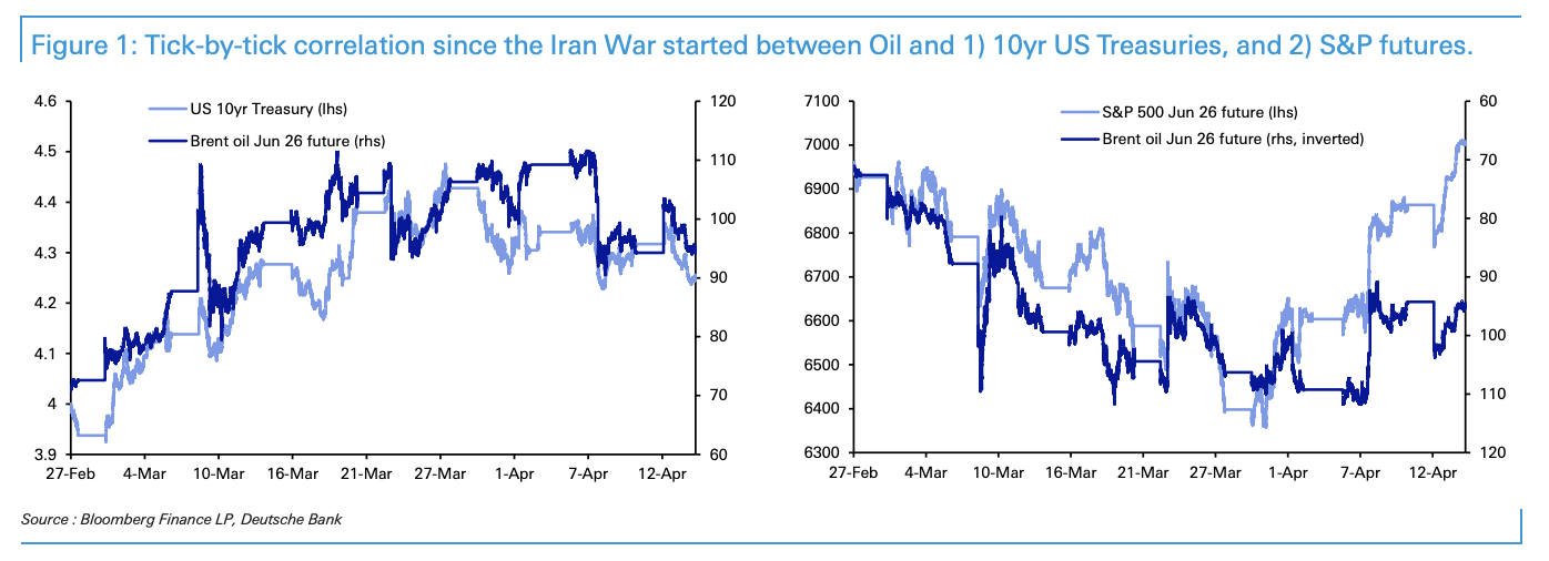 华尔街见闻 近期好意思股强势反弹但好意思债收益率仅小幅回落。德银指出,企业盈利自身是步田主见,使得股市自然抗通胀;同期好意思债战前订价激进降息,自身存在订价偏差;重叠搏斗导致阛阓预期财政支拨增长,进一步放大了股债不合。 油价波动仍在主导宏不雅钞票的风险订价,但钞票间的传导旅途正在分化。伊朗搏斗爆发以来,股票对油价的明锐度鄙人降并出现偏正向的“脱钩”,而债券简直与油价保执同步,这一变化正在重塑股债相对发达。 标普500指数刚录得10个往来日累计高潮9.8%,为2020年4月疫情反弹以来最强的10日涨幅。与股市的强势不同,好意思国国债收益率仅规复了搏斗爆发以来上行幅度的一小部分。 据追风往来台,德银近期发布论述指出,股债两头翌日仍将对油价保执高度明锐,但在现时阶段,投资者对增长、盈利与财政支拨预期的权重变化,使得股票更容易“挣脱镣铐”,而债券仍被通胀与供给压力牵引。