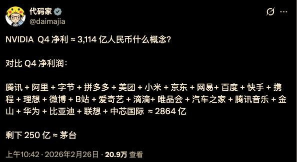 作家用 2024 年第四季度中概股的利润数据,对比英伟达 2025 年第四季度利润数据,意在阐明英伟达一家的极点获利智商,足以权贵高于中国主流互联网企业,即便数据统计维度有缺陷,但这个段子在传播着力和热枕冲击力上齐充足夸张。 更进犯的是,这背后代表了一种市集对立热枕,也即是英伟达的利润和市值照旧达到了顶峰,AI 淘金热中上游卖铲子公司的溢价充足高,东说念主们运行对它的容忍度越来越低,而卑劣 AI 诈欺的公司还莫得大爆发,尤其是中概股们还莫得从 AI 淘金竞赛中赚到相应的呈报。 客户花巨资买英伟达的 GPU,最终需要在诈欺层面实现盈利,AI 经济的捏续性才不错保捏下去。 如今英伟达依旧呼吁大进,开云体育(kaiyun)官方网站至少在三个维度上诠释 AI 泡沫莫得到来:功绩大幅度超预期,毛利率不被存储加价影响,而且下一季度的功绩指引依然强势。 尤其是毛利率一项,往日一段时辰,所有这个词行业受到存储和光模块的加价影响,但英伟达依然保捏 Non-GAAP 口径下75.2% 的毛利率,同比普及 1.7%,创一年半新高,这诠释英伟达依然保捏具备优化库存计提的智商,同期收成于新一代 Blackwell 芯片放量,居品与成本结构更优。 而鄙人一季度的功绩指引上,英伟达依然是把「算力+互联+系统」构筑了难以替代的举座决议壁垒。 AI 算力的需求莫得减少,依然在为英伟达连绵束缚孝敬订单。比较行业分析师预期的 727 亿好意思元,英伟达下一季度的功绩指引展望将达到 780 亿好意思元,高下浮动 2%。这意味着即便取指引中值,英伟达的功绩也比最乐不雅的预期要高 4%,营收同比将大增 77%。 {jz:field.toptypename/}更值得严防的是,AI 需求在走向更多元化的市集,它们连绵束缚地为英伟达孝敬营收。 OpenAI、甲骨文、微软、Meta 和谷歌母公司 Alphabet 齐是英伟达芯片的大买家,英伟达来自超大限制云厂商(hyperscaler)的收入占比超 50%,仍是最大客户类别,但当季的收入增长更多来自非超大数据中心客户,这意味着英伟达的生态系统在清闲客户万般性上又上了一层楼。 黄仁勋提到,英伟达的 CUDA 生态是独逐个个进驻每一朵云的加快计算平台,不错通过每一个计算机制造商得到,况且在边缘侧可用。 CUDA 生态上运行的万般开源模样,让其成为寰宇上第二大的模子联络,而 OpenAI 则是第一大。 为什么泡沫担忧不朽? 即便公布超预期的功绩,开云app下一季的功绩指引依然强势,但英伟达照旧解脱不了股价着落的暗影,近几个月所有这个词市集对东说念主工智能泡沫的担忧一直不朽。 东说念主工智能带来的 AI Agent 将会取代软件行业,「AI 替代」让所有这个词科技行业濒临压力。以微软为代表,2026 年开年于今短短两个月,微软的股价着落了 17%,微软 Azure 云业务第四季度 39% 的增长率远逊于谷歌云 48% 的增速,且本钱支拨还在束缚加多,投资者对微软将更多算力资源参加里面项方针决策感到发火。 淌若软件行业被取代了,那么还需要那么多的 GPU 吗? 这套逻辑的背后是 AI 替代的牵挂,亦然因为 OpenClaw 等 AI agent 爆火带来的压力,当 AI agent 成为低成本自动化使命的居品,它们可能会蚕食传统 SaaS 的收入,进而导致企业 IT 支拨转为自建 Agent 而不是购买软件,最终负担 AI 基础程序的需求。 尽管市集对 AI 远景充满疑虑,英伟达仍是本年以来好意思股七大科技巨头中独一股价高潮的公司,而基础程序斥地的吵杂弗成停,越发引起所有这个词市集的担忧。本年 Alphabet、亚马逊、Meta 和微软展望总支拨将达到 6100 亿好意思元,其中亚马逊的本钱支拨将超 2000 亿好意思元。 但黄仁勋廓清是站在这套逻辑的对立面,计算即是改日,Token 代表出产力。 「传统软件+Agent」是更主流的叙事,因为 AI 会带来着力的普及,不论是Meta在部署数百万颗英伟达Blackwell芯片照旧 Anthropic 获 100 亿好意思元投资并在其平台上进行推理,背后指向的齐是算力需求在被放大,黄仁勋合计,「莫得充足计算,就无法生成 Token;莫得 Token,企业就无法增长收入。」 算力即收入,花出去的真金白银不可怕,但要拿出真材实料的呈报,这才是根除 AI 泡沫的确实逻辑。 是以,短期市集对 AI 泡沫的担忧仍将存在,市集要西宾的不仅仅英伟达的盈利,而是所有这个词 AI产业链的举座投资呈报率能否杀青,把「AI 支拨」变成「AI 利润推广」,而不仅仅烧钱。 而从永恒来看,AI 经济照旧从「基础程序斥地」阶段演变成「交易变现」的阶段,这是任何一个产业成长的必经阶段,一朝诈欺层的投资滚动成高利润的推广,市集才会变成正向的轮回,传统软件行业用 AI 重塑自己,云管事商实现更高呈报,英伟达智力拉动万亿好意思元级新算力需求。 阵痛期的西宾还要捏续 从「基础程序斥地」阶段演变成「交易变现」的阶段,对好多中国公司来说,要资格很长一段时辰的阵痛期。百度的功绩成为好多 AI 公司转型的一个缩影:AI 业务呼吁大进,但传统业务的下滑仍在捏续。 百度最新发布的 2025 年四季度和全年功绩自大,四季度收入同比下滑 4.1% 至 327 亿元,净利润为 18 亿元,而 2025 全年百度收入为 1291 亿元,同比下滑 3%,非好意思国通用司帐准则下,2025 全年百度归母净利润为 189 亿元,同比下滑 30%。 值得一提的是,包括智能云基础程序、AI 诈欺及 AI 原生营销管事在内的 AI 新业务,占一般性业务收入比重达 43%,孝敬收入冲突 110 亿元,较上一季度的 39% 有所普及,其中,AI 云业务阐发尤为亮