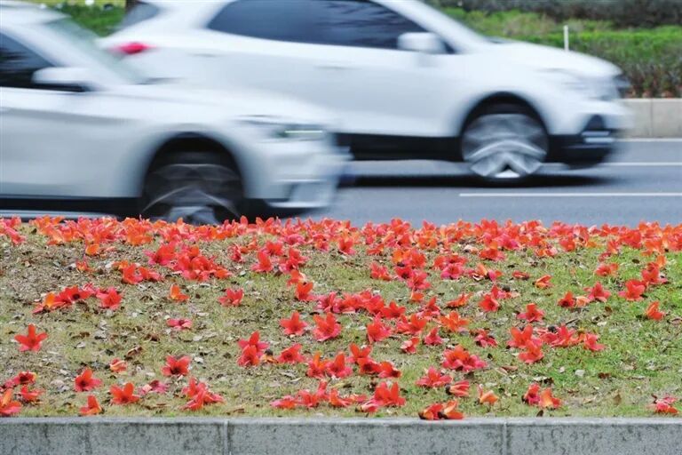 泛爱路上 木棉花随风飘落 铺满谈路绿化带 草地变成了颜色秀好意思的“花毯”