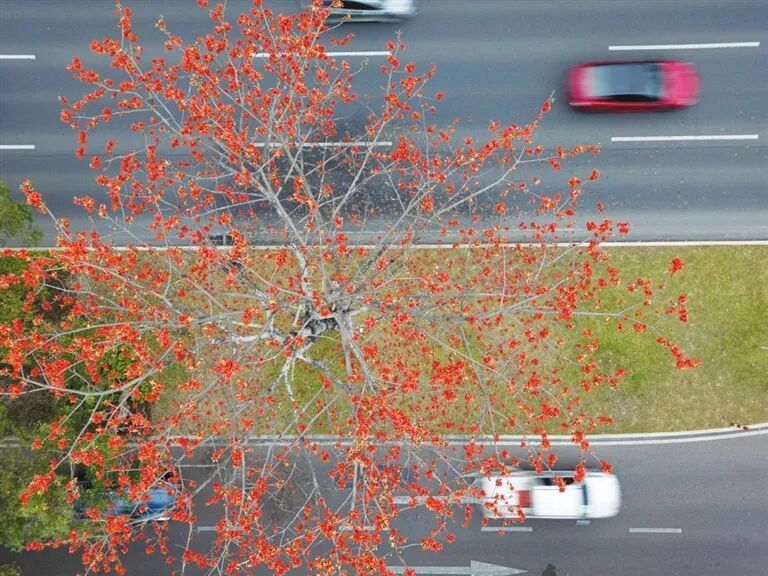 春节事后 泛爱路的木棉树迎来盛花期 满树红花如霞似火