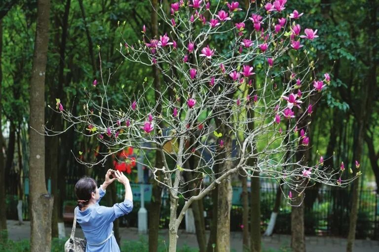 紫马岭公园 市民正在不雅赏 通达的玉兰花