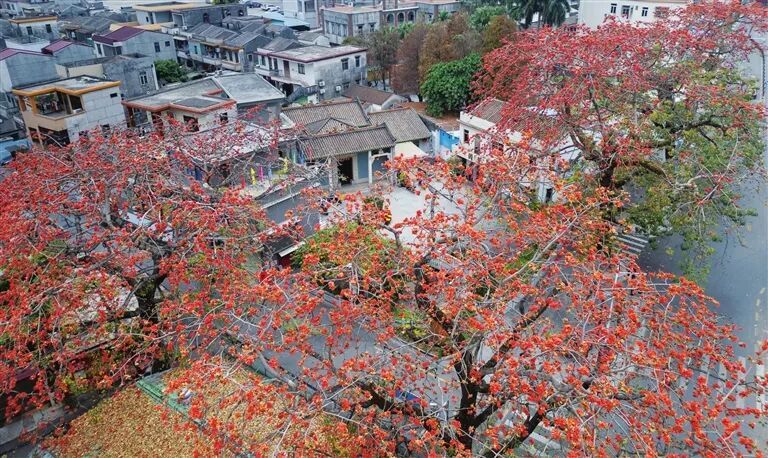沙溪镇岗背村 四棵百年木棉树盛放 满树殷红的 “英杰花” 如火焰般通达 与周围的岭南古村、祠堂牌楼 和当代街谈交汇成一幅特有的画卷