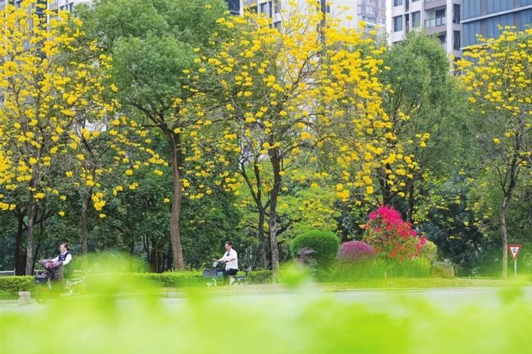 泛爱七路 黄花风铃木雕梁画栋 金黄的花海与绿植、树立 组成了城市春日里 一谈亮丽的风物线 开云体育官网
