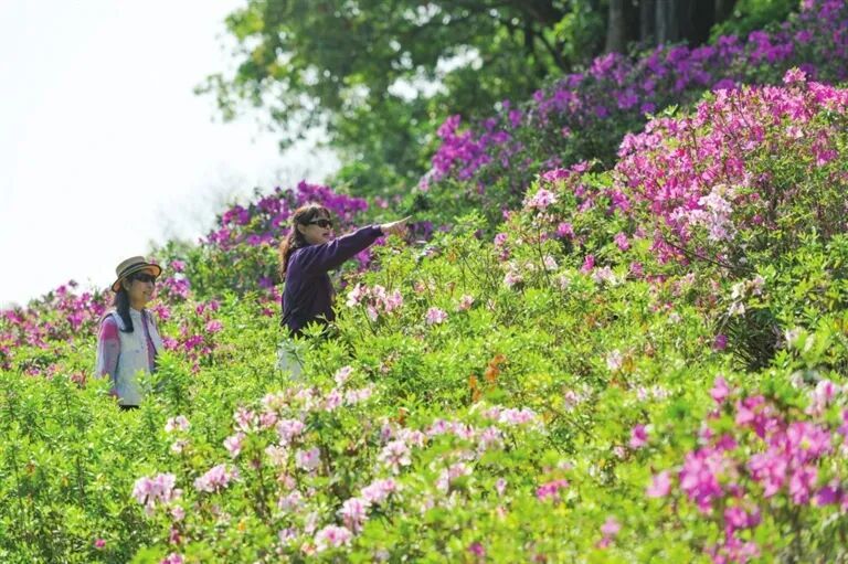 孙文追忆公园 杜鹃花在春日的阳光下 灿烂通达 市民在花海中山外有山