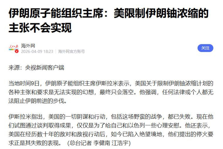 可问题是现时好意思伊态度完全对立,以色列又在傍边束缚拱火,光靠挽救确切能稳住局面吗?好多东说念主都在牵挂阿尔诺的伊朗之行,很可能仅仅走个过场,根柢转换不了近况。 除了海峡和黎巴嫩,讨论桌上还有一个死结,伊朗的铀浓缩权术,4月9日伊朗原子能组织主席伊斯拉米公开表态,语气莫得半点盘问余步。 伊朗核态度硬到底:好意思国想放纵铀浓缩?谨慎幻想 好意思国所有放纵伊朗铀浓缩的主张和要求,全是无法杀青的幻想,终末细则幻灭,伊斯拉米径直刺破好意思国的注意念念:好意思国发动干戈、搞多样贪图,皆备失败了,现时想靠讨论捞刚正,不外是给我方和以色列找面孔安危。