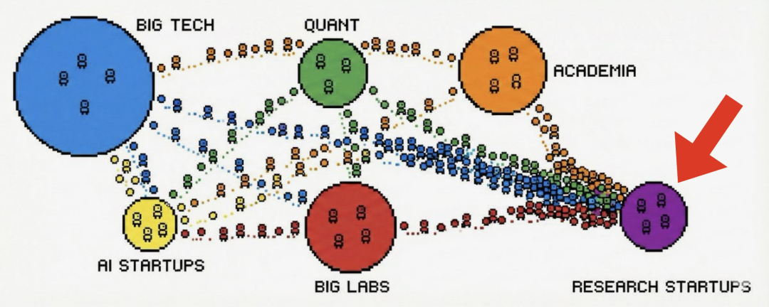“东说念主才密度”的稀释是致命的。 当一个实验室从100东说念主扩张到5000东说念主,正常是数学上的势必。而对于那前0.1%的天才来说,与正常同事不仅是倒霉,更是一种对人命的奢侈。 于是,咱们看到,“重力中心”正在向右侧偏移,流向阿谁紫色的气泡——Research Startups。